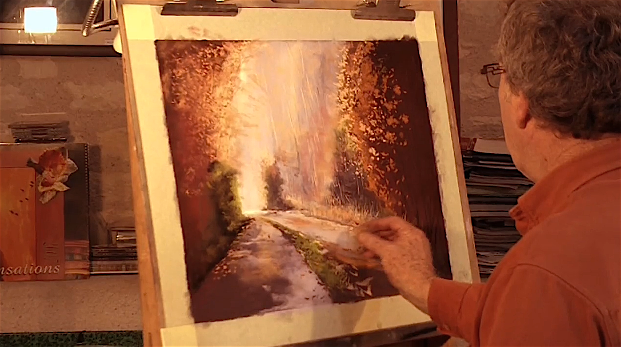 In his studio, the pastel artist paints a imaginary landscape. The whole process is filmed.